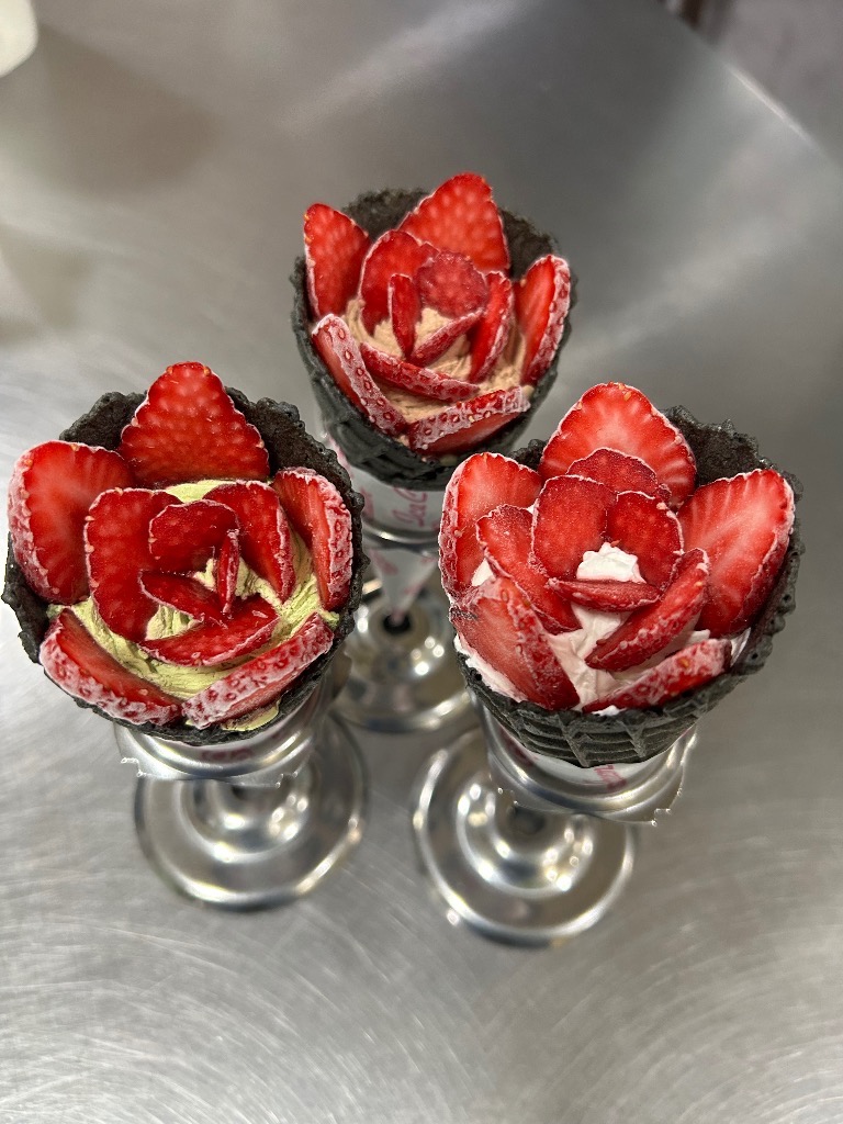 食用炭を使ったワッフルコーンに、真っ赤なイチゴ♪